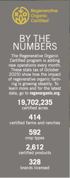 To achieve ROC designation, farmers must nurture the vitality of the soil by planting cover crops, pasturing livestock, applying compost, and using other chemical-free practices. Soilless systems, such as hydroponics, can currently receive the USDA Organic certification, but they are not eligible for the ROC label. “Soil building is the foundation of everything we do,” Barrett says.