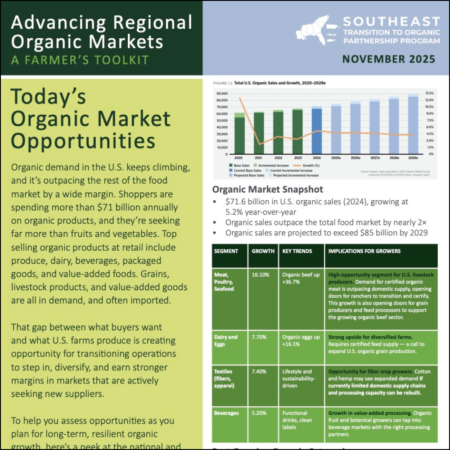 This four page guide aims to support Southeast farmers in unlocking more regional production of high-demand organic crops, reduced dependence on imports, and more resilient U.S. supply chains rooted in local identity through data, insights, and opportunity analysis.