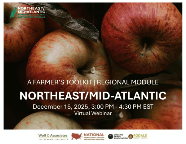 Calling all Northeast/Mid-Atlantic farmers and stakeholders! Join us for an in-depth walkthrough of “Advancing Regional Organic Markets: A Farmer’s Toolkit”, a new resource designed to strengthen regional organic economies. This toolkit provides farmers and stakeholders with data, insights, and opportunity analysis to help expand regional production of high-demand organic crops, reduce reliance on imports, and increase economic opportunities for U.S. farmers. During this webinar, we’ll explore how to use the toolkit to identify key market opportunities in the Northeast/Mid-Atlantic, support resilient supply chains rooted in local identity, and foster stronger connections between producers, processors, and buyers.