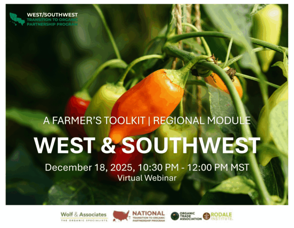 Chiamata a tutti gli agricoltori e gli stakeholder che vivono nelle regioni occidentali e sud-occidentali! Unitevi a noi per una panoramica approfondita di "Advancing Regional Organic Markets: A Farmer's Toolkit", una nuova risorsa progettata per rafforzare le economie biologiche regionali. Questo toolkit fornisce ad agricoltori e stakeholder dati, approfondimenti e analisi delle opportunità per contribuire ad espandere la produzione regionale di colture biologiche ad alta domanda, ridurre la dipendenza dalle importazioni e aumentare le opportunità economiche per gli agricoltori statunitensi. Durante questo webinar, esploreremo come utilizzare il toolkit per identificare le principali opportunità di mercato nelle regioni occidentali e sud-occidentali, supportare filiere resilienti radicate nell'identità locale e promuovere legami più forti tra produttori, trasformatori e acquirenti.