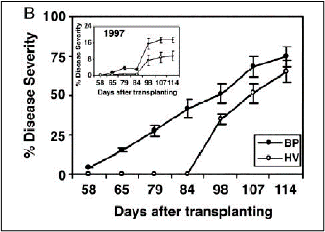 Veccia pelosa (Villosa veccia) è una popolare coltura di copertura utilizzata da molti coltivatori di ortaggi e colture da campo come fonte di barriera contro l'azoto e le erbe infestanti nel no-till basato su colture di copertura. Come concime verde, la veccia pelosa fornisce costantemente 80 libbre o più di azoto prontamente disponibile per il seguente raccolto da reddito (Clark, 2008). La pacciamatura di veccia pelosa utilizzata per la produzione di pomodori senza aratura ha portato a un aumento delle rese (Abdul-Baki et al., 1996; Abdul-Baki et al., 2002) e ha ridotto la peronospora precoce (Alternaria solani) e la macchia fogliare Septoria (Septoria licopersici) (Figure 1 ) rispetto al pacciame plastico nero e ai trattamenti a terra nuda (Kumar et al., 2004; Mills et al., 2002). Sebbene il residuo del raccolto abbia ridotto gli schizzi di terreno infestato sulla vegetazione delle piante (Mills et al., 2002), ulteriori indagini hanno rivelato che anche il meccanismo che aumenta i raccolti e riduce la malattia fogliare può avere una base molecolare. I geni associati alla fotosintesi, alla senescenza delle piante e alla difesa delle piante contro i patogeni sono stati sovraregolati ed espressi per un periodo di tempo più lungo nei pomodori coltivati in una veccia pelosa senza aratura rispetto a un pacciame di plastica nera (Kumar et al., 2004).
