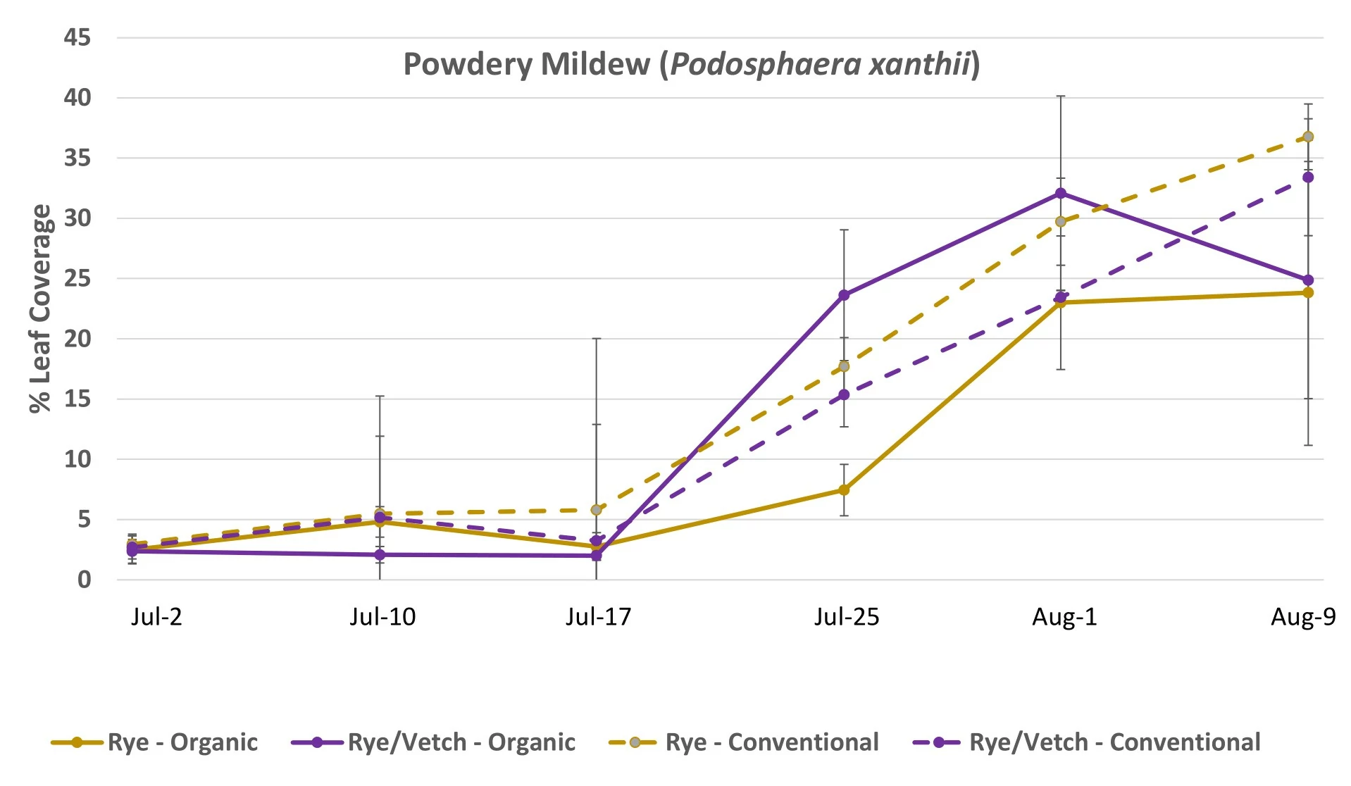 In questo articolo presentiamo solo i risultati del 2019, poiché le forti piogge record del 2018 (http://www.nrcc.cornell.edu/) hanno reso gli spray fungicidi, la gestione delle infestanti e le attività sul campo una sfida. L'infezione da oidio è aumentata in modo significativo nel corso della stagione in tutti i trattamenti dopo il 17 luglioth (Figure 2 ). L'esordio della malattia era evidente entro il 25 luglioth e progredito in tutti i trattamenti. Non ci sono state differenze nella percentuale di infezione tra parcelle organiche e convenzionali né tra trattamenti con colture di copertura (Figure 2 ).
