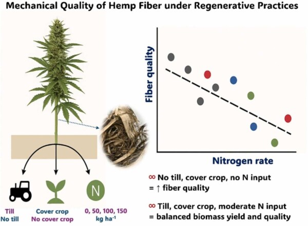 Industrial hemp (Cannabis sativa L.) is an emerging crop for renewable fiber materials. For farmers, finding a balance between agronomic performance and economic return is crucial, especially when targeting specific markets like the textile industry, which values not just fiber quantity, but overall quality. This field study, conducted at the Rodale Institute in Kutztown, Pennsylvania, assessed the effects of tillage (till vs. no till), cover crop (with cover vs. no cover), and nitrogen (N) rate (0, 50, 100, 150 kg ha⁻¹) on hemp fiber yield, N concentrations in leaf and stalk, and mechanical performance under regenerative organic conditions. Fiber mechanical properties, including maximum load, tenacity, work of rupture, and modulus of elasticity were analyzed at Thomas Jefferson University. Results showed that biomass yield increased with N input, peaking at 9.2 Mg ha⁻¹ under till systems with cover crop at 150 kg N ha⁻¹ . However, fiber quality declined at higher N rates. The highest fiber quality metrics, including tenacity (610.5 MPa), modulus of elasticity (3.5 GPa), and work of rupture (31.4 newton mm⁻²) was achieved in no till system with cover crops and no N addition. A clear trade-off emerged: high N increased biomass yield but compromised fiber quality, while moderate input levels (e.g., till system with cover crop at 50 kg N ha⁻¹) offered a balanced outcome. This suggests that regenerative practices not only support soil health but also improve fiber strength and flexibility. Farmers can tailor input strategies to match end-use goals: low-input systems for premium textile fibers and moderate inputs for bio-composite applications, supporting both ecologically sound and market demands.